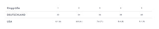 Wir bieten unsere Ringe aktuell in 5 Größen an. Weitere Größen können auf Anfrage gefertigt werden. In der Ringgrößentabelle finden Sie amerikanische und deutsche Ringgrößen. Verwenden Sie auch gern die gängigen internationalen Umrechnungstabellen für Ringgrößen. Vor Start der Fertigung senden wir Ihnen unser Ringmaß zu, mit dem Sie Ihr genaue Ringgröße bestimmen können.